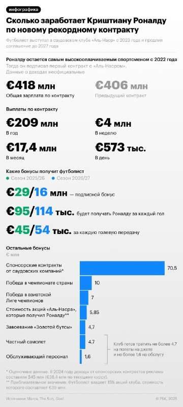 Давайте на минутку отвлечемся от сухих цифр и попробуем осознать масштаб. Новый контракт Криштиану до 2027 года принесет ему €418 миллионов. Это не считая тех €406 миллионов, что уже уютно устроились на его счетах по предыдущему соглашению. Итого — почти миллиард евро за несколько лет игры в футбол под жарким аравийским солнцем.