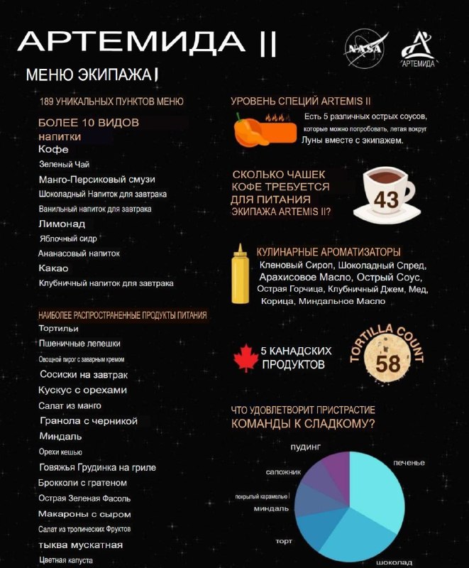 Забудьте о сухих пайках и суровой романтике лишений! Меню современных астронавтов на 10 дней заставит глотать слюнки даже шеф-поваров элитных заведений. В невесомости нынче подают сочное барбекю, пикантные сосиски и любимые всеми макароны с сыром (домашний уют даже на орбите!). На закуску — отборный миндаль, кешью, экзотический салат из манго и тропических фруктов. А чтобы космическая жизнь не казалась пресной, к блюдам прилагаются целых пять видов соусов разной степени жгучести. Как гласит народная мудрость: «Хорошо там, где нас нет… но где есть макароны с сыром!»