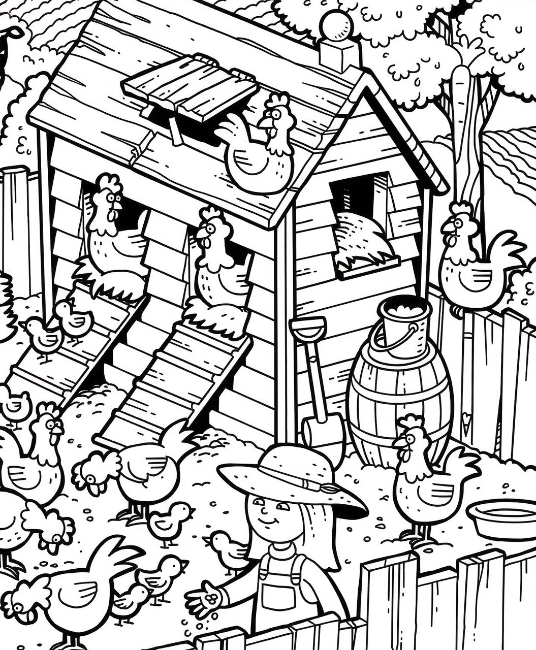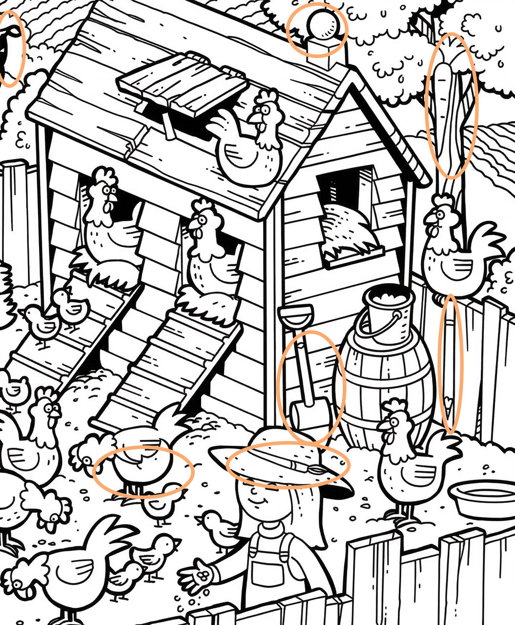 Если прищуриться (или, наоборот, широко раскрыть очи), можно обнаружить предметы, которым в курятнике явно не место. Морковь — ладно, допустим, это витаминная добавка для несушек. Но молоток? Неужели цыплята решили сколотить себе новую жизнь? А месяц среди бела дня? Сюрреализм, достойный кисти Дали!