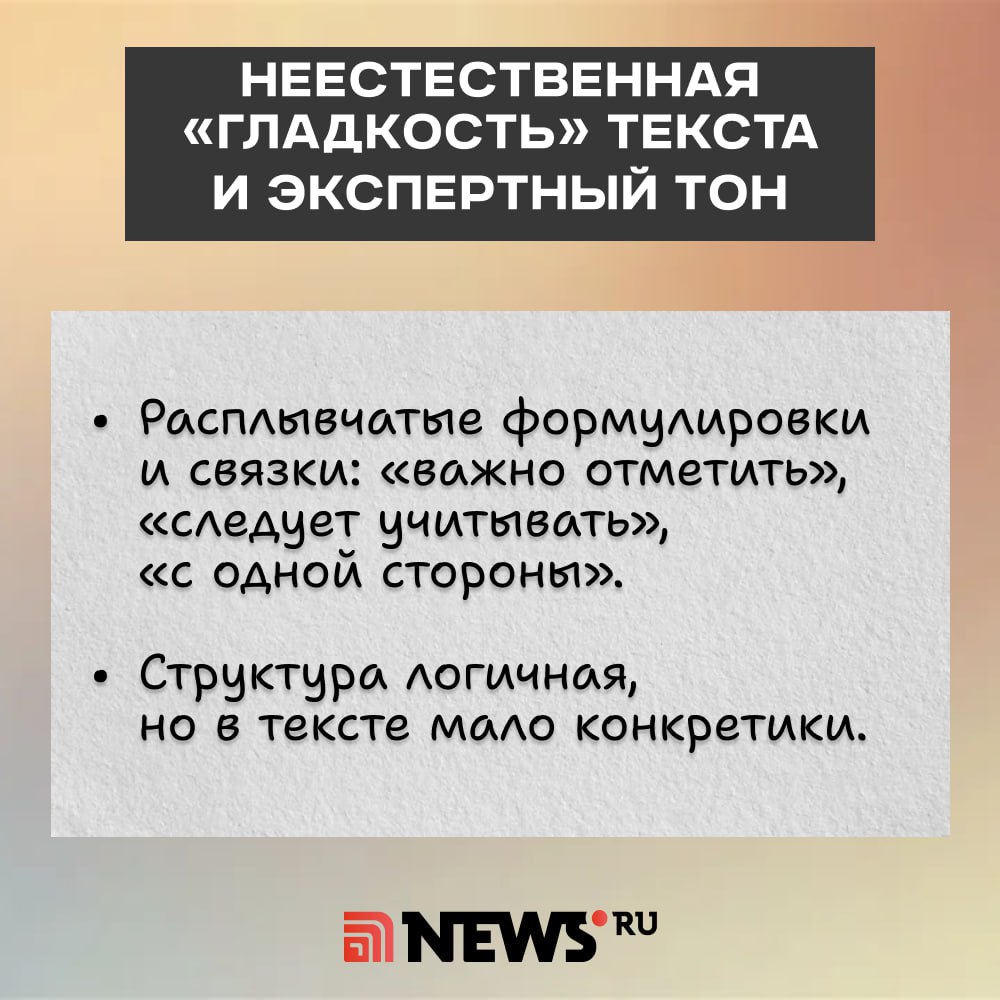 Если текст течет слишком плавно, как вода из крана, и в нем нет ни одной шероховатости, за которую мог бы зацепиться глаз, — насторожитесь. Живой человек пишет сердцем, а оно, как известно, иногда сбоит, радуется или грустит. Нейросеть же пишет алгоритмами.