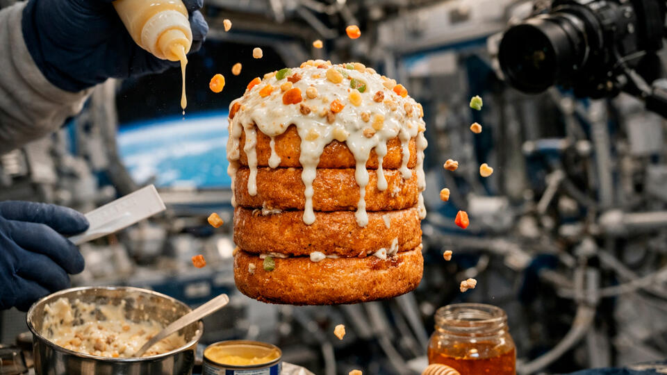 «Коврижки у нас есть такие космические, их пропитывают медом или сгущенкой и склеивают между собой. Формируют куличи, а потом заливают их жидким творогом с орехами», — с аппетитом рассказывает космонавт. Звучит как симфония калорий, не правда ли?