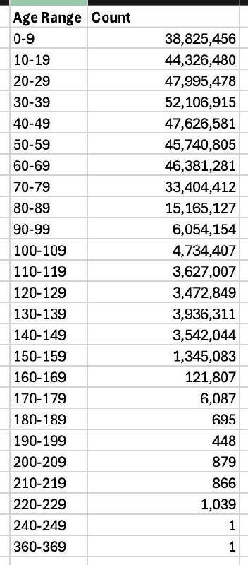 Но и это еще не все! Держитесь крепче за свои кресла-качалки: около трех тысяч граждан США, по данным Маска, перемахнули двухсотлетний юбилей. Вот уж действительно, «жизнь бьет ключом», как говаривала Фаина Раневская.