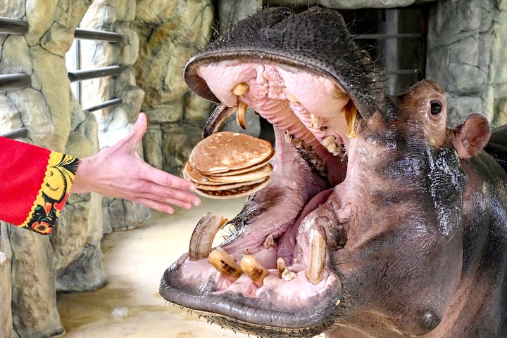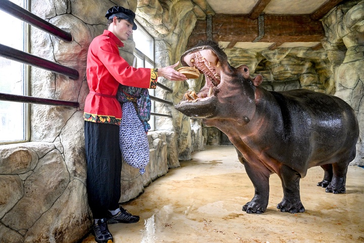Зиму проводили в Бахчисарае тоже необычным способом. Традиционное чучело не стали сжигать, а скормили бегемоту. Чучело было сделано из сена с овощами.